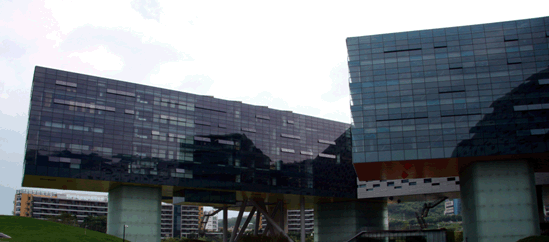 万科中心位于深圳盐田海滨,采用创新的 “斜拉转换结构体系”,将五层框架结构建于56m跨度或20m悬挑端15.5m高斜拉桥上,实现了“漂浮于地平线上的摩天大楼”的建筑构想。